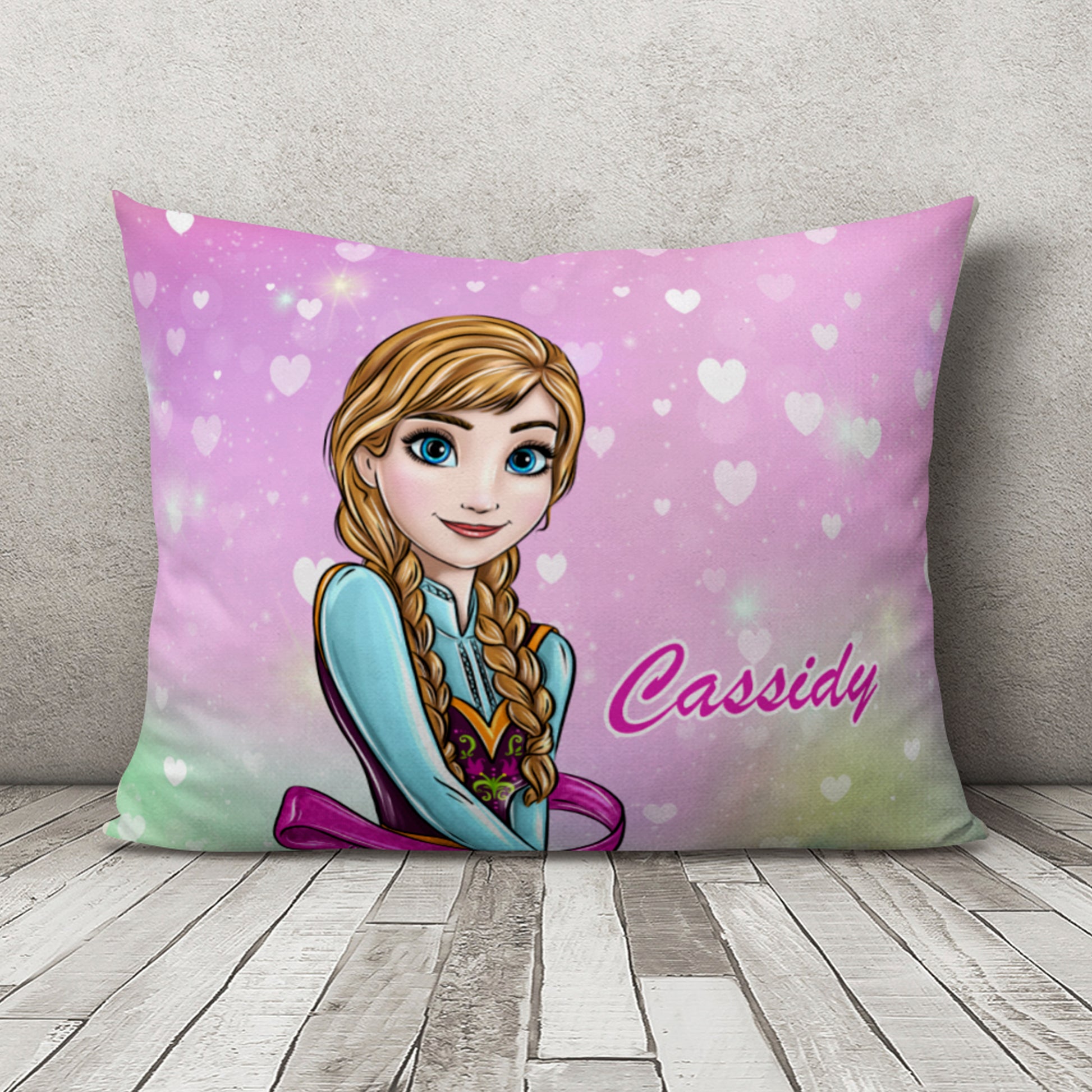 This is a personalized bed pillowcase with a cute pattern and name.